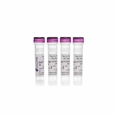 The polymerase is supplied with a 5x buffer containing MgCl2 and proprietary mix of enhancers (dNTP's not included). For convenience, Accuris Taq is also available in a ready to use 2x Master Mix - just add primers and template DNA. The "Red Dye" Master Mix incorporates a red loading dye that allows amplified samples to be loaded directly on an agarose gel. The red colour aids in visualisation during pipetting, and higher density of the buffer ensures that the samples will drop into the gel wells.