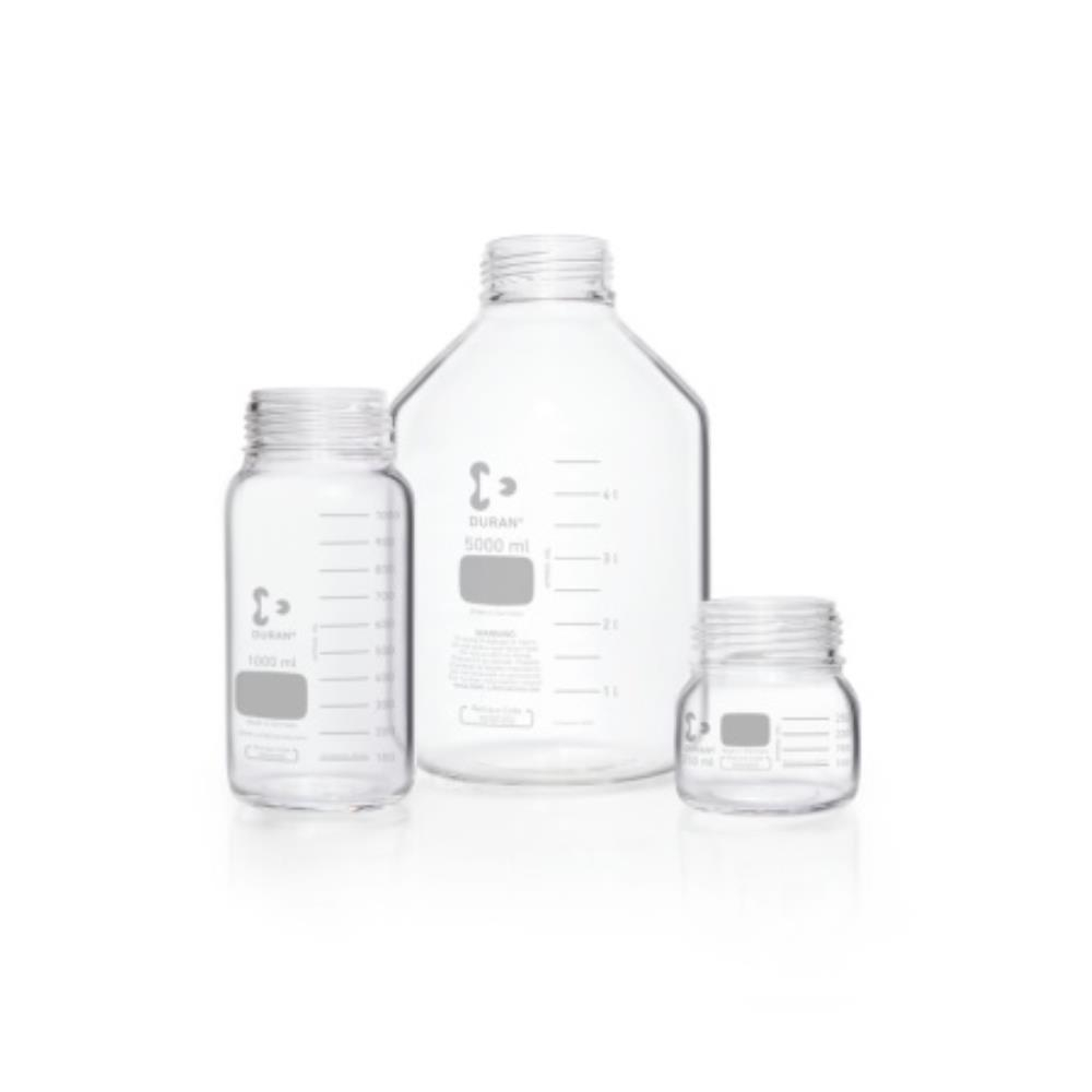 DURAN® wide mouth GLS 80® laboratory bottles are moulded from high-purity, clear, USP/EP Type I borosilicate glass 3.3, renowned for its excellent thermal performance, and high resistance to chemical attack. A combination of high-performance materials and robust ISO 4796-1 design provides a long working life. The bottles feature an easy-to-read graduated volume scale, and marking field in permanent white enamel. Permanent Retrace Code on each bottle for manufacturing lot traceability. DURAN® wide mouth GLS 80® are supplied complete with blue polypropylene cap and drip-free pouring ring for use up to 140°C. All components are fully autoclavable at 121 or 134°C.
